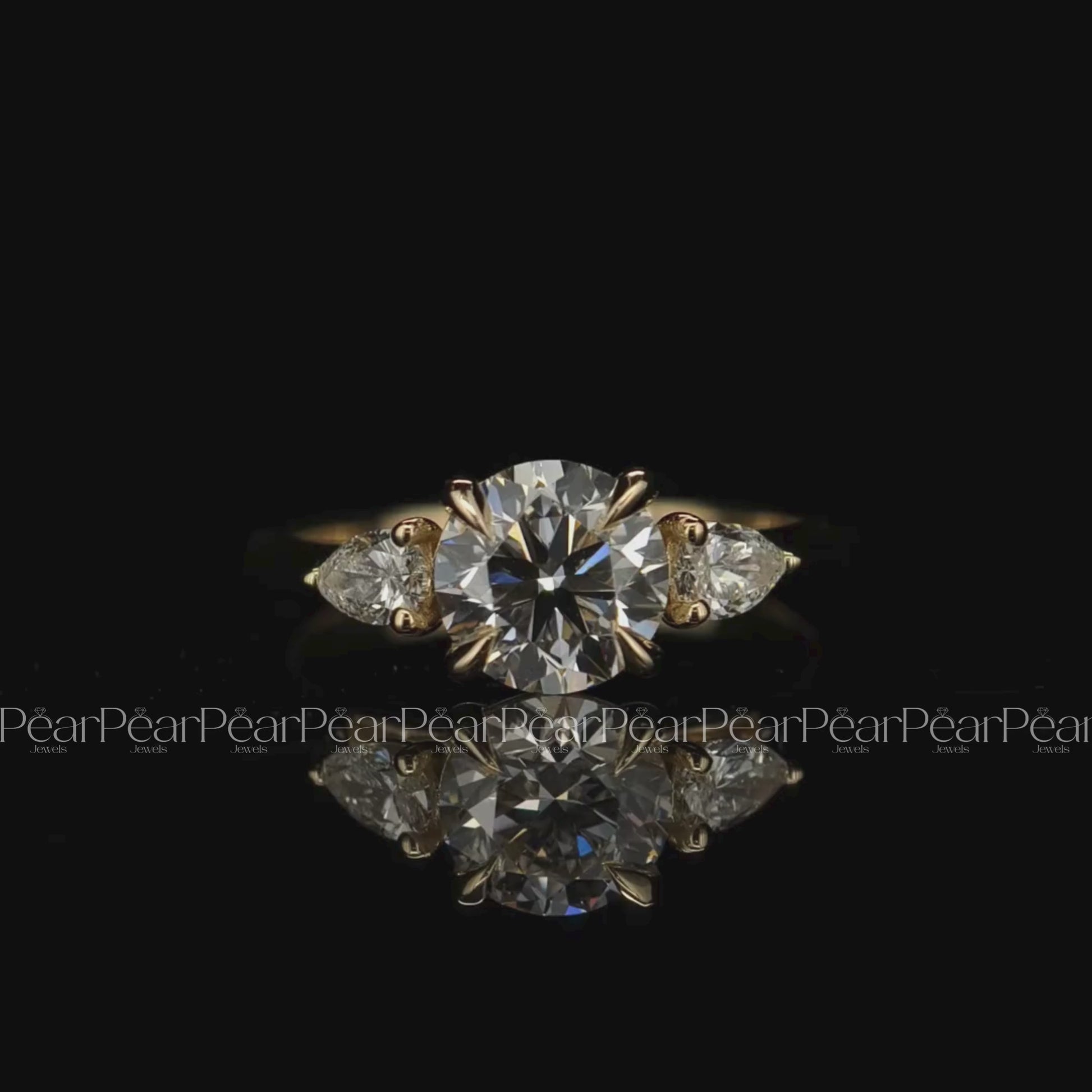 This 1.5Ct lab-grown diamond engagement ring features a stunning round-cut center stone, flanked by two shimmering pear-shaped diamonds for a refined, graceful silhouette. A modern classic, this three-stone design symbolizes your journey together—past, present, and future—crafted with sustainable brilliance and timeless beauty.