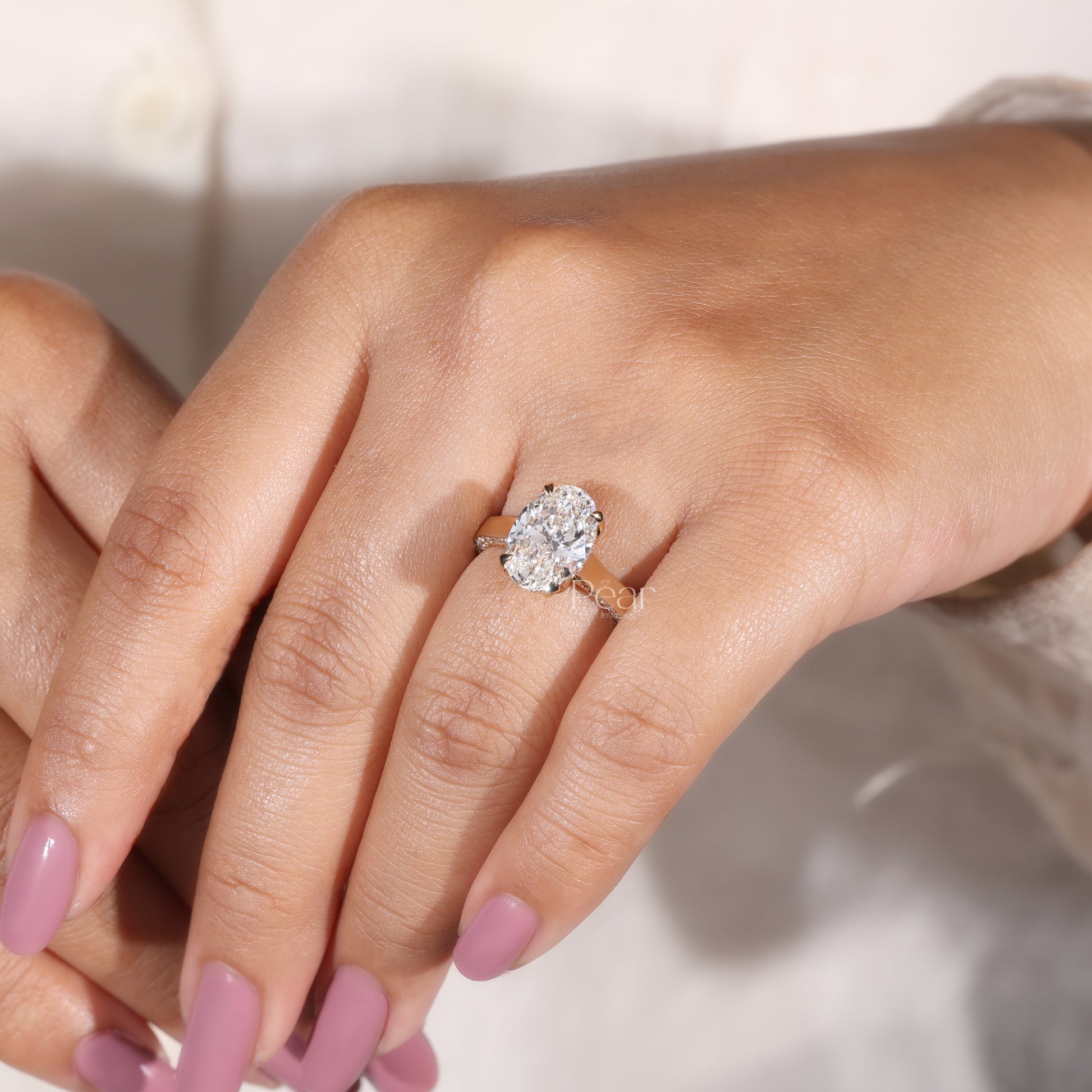 A delicate pavé-set band adds a refined line of sparkle, perfectly complementing the 3.00 carat oval-cut lab-grown diamond, selected in E colour and VVS2 clarity for outstanding purity, fire, and balance. The elongated oval silhouette creates a flattering look on the hand, while the cathedral profile delivers timeless sophistication with modern craftsmanship.