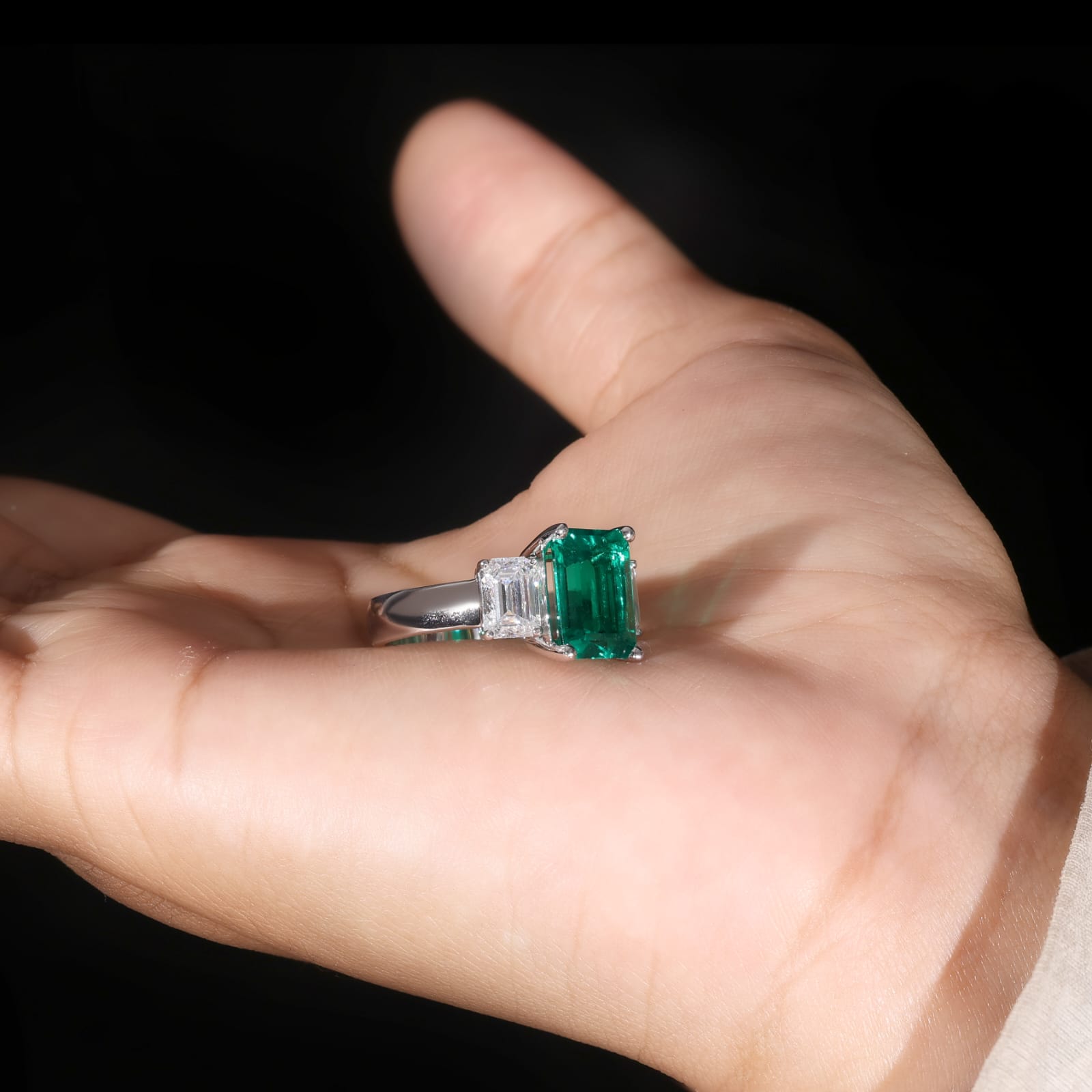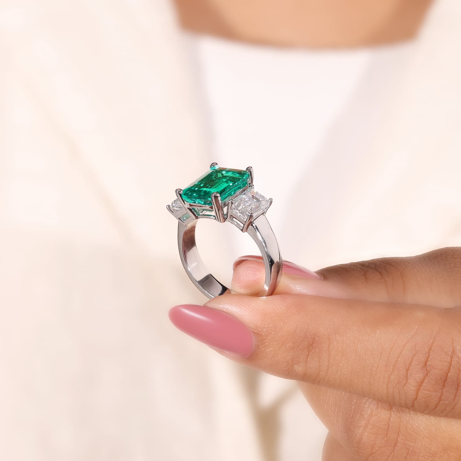 Make a bold statement with this exquisite emerald-cut masterpiece, designed for those who appreciate timeless elegance with a modern edge. Featuring a striking 3.00CT emerald-cut lab-grown center stone, this ring is beautifully complemented by two 1.00CT side stones, creating a balanced and luxurious three-stone design.