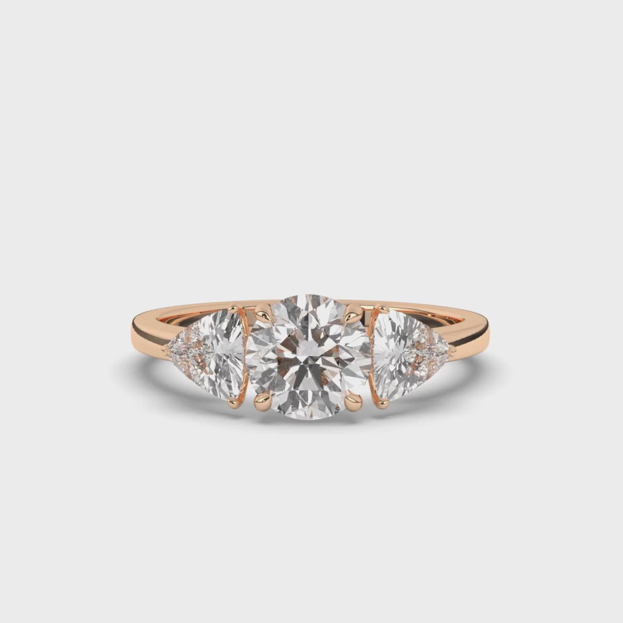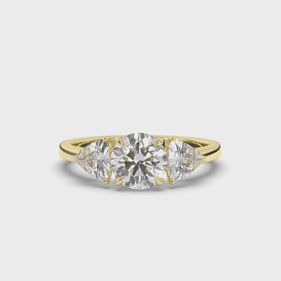 A Three-Stone Round & Trillion Lab-Grown Diamond Ring features a brilliant round-cut lab-grown diamond at the center, accented by two trillion-cut lab-grown diamonds on either side. The round center stone maximizes brilliance, while the trillion side stones add a modern, angular touch, enhancing the overall sparkle and elegance. This sophisticated design symbolizes the past, present, and future, making it a stunning choice for engagement rings or special occasions.