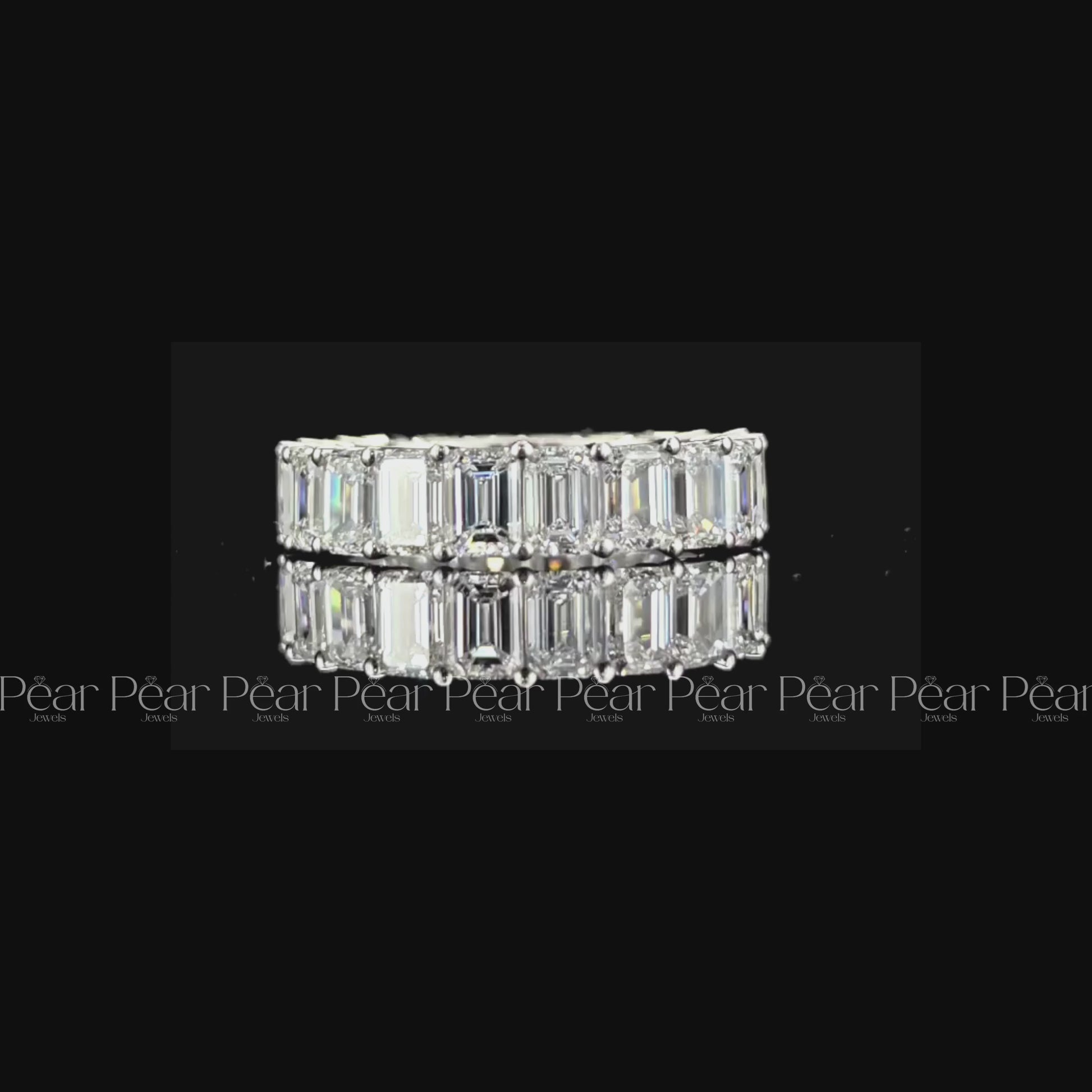 An emerald-cut diamond eternity band is a timeless and elegant piece of jewelry. It features a continuous circle of emerald-cut diamonds, each precisely cut to emphasize their clarity and long, step-like facets. This design creates a sophisticated and symmetrical look, perfect for weddings, anniversaries, or special occasions.
