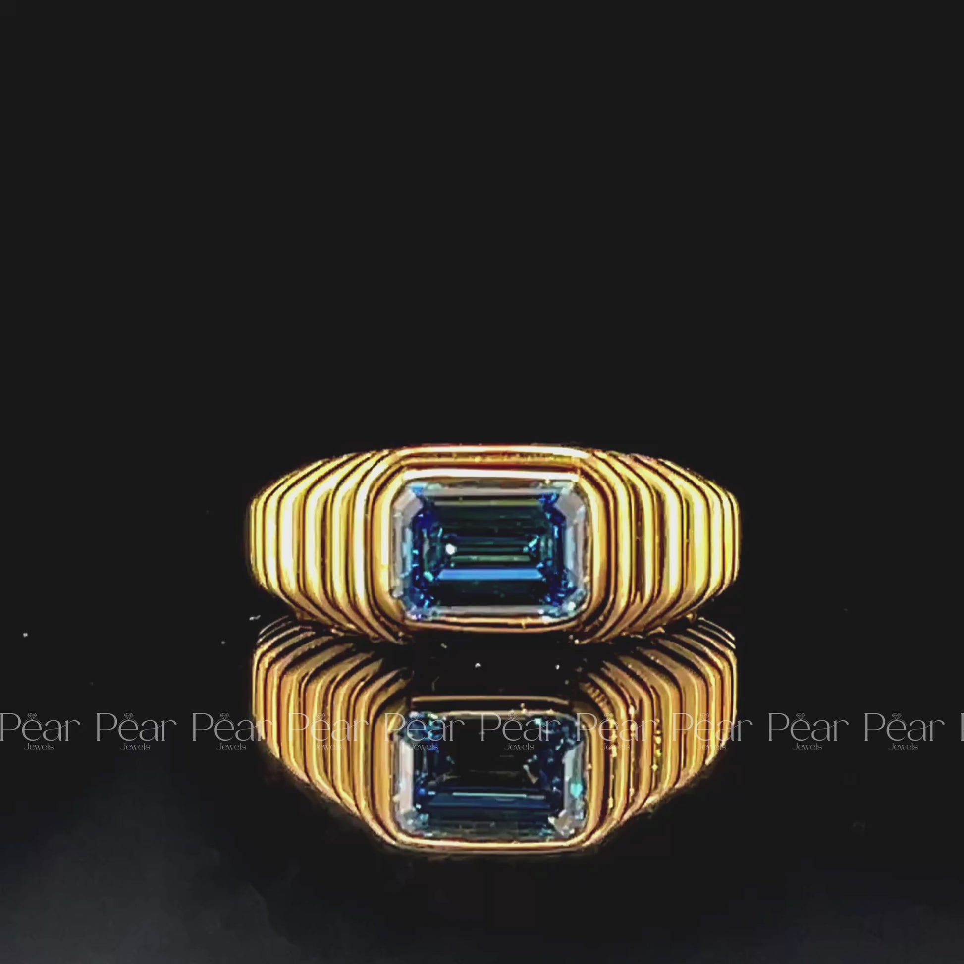 A bold modern classic. Featuring a 1.5-carat lab-grown blue emerald-cut diamond in a sleek bezel setting, this ring blends vibrant color with clean, contemporary lines—perfect for a love that’s anything but ordinary.