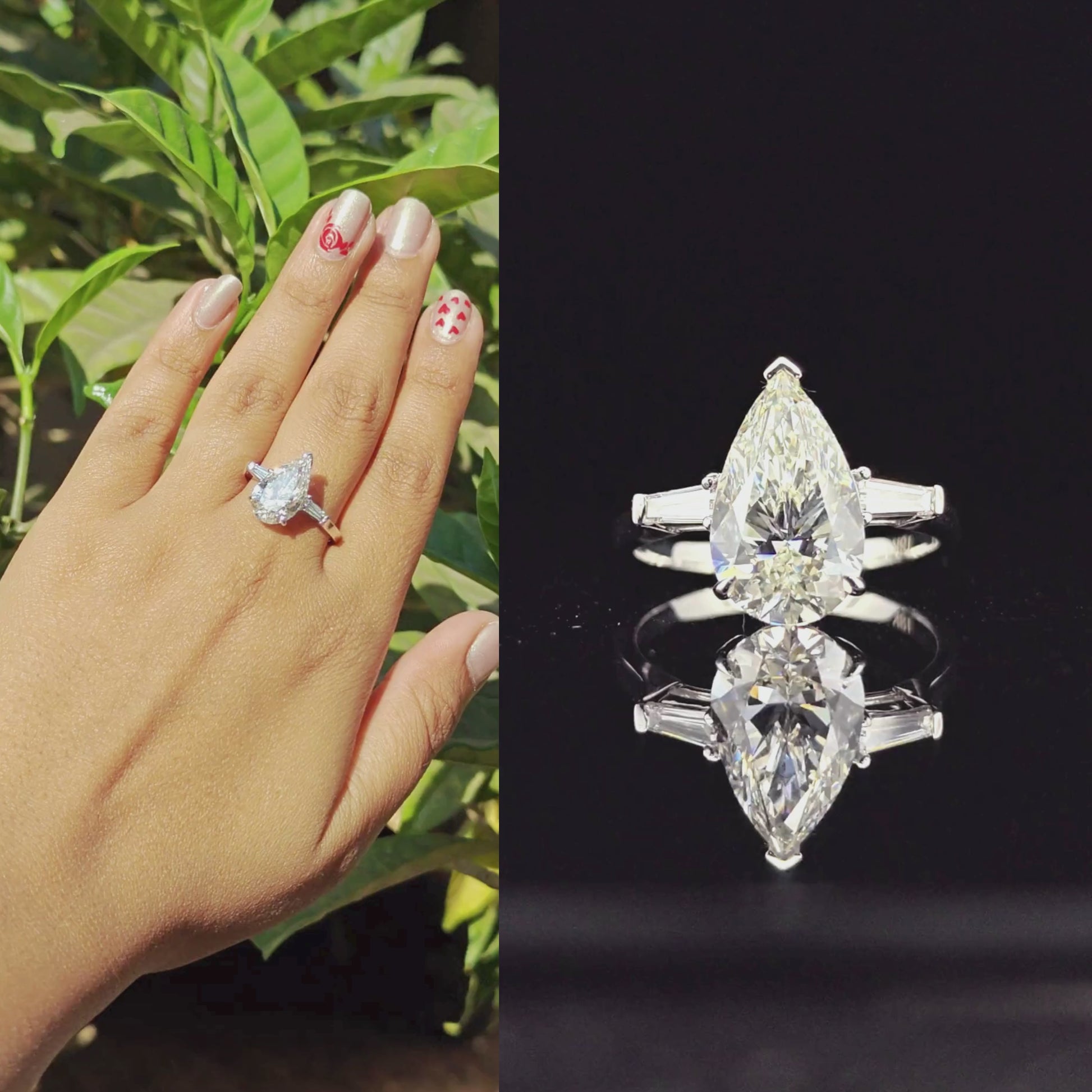 A Pear Three-Stone Tapered Baguette Lab-Grown Diamond Ring is a sophisticated and romantic design, combining the graceful elegance of a pear-cut diamond with the timeless appeal of baguette side stones. This ring offers a stunning balance of brilliance, elegance, and modern sustainability.