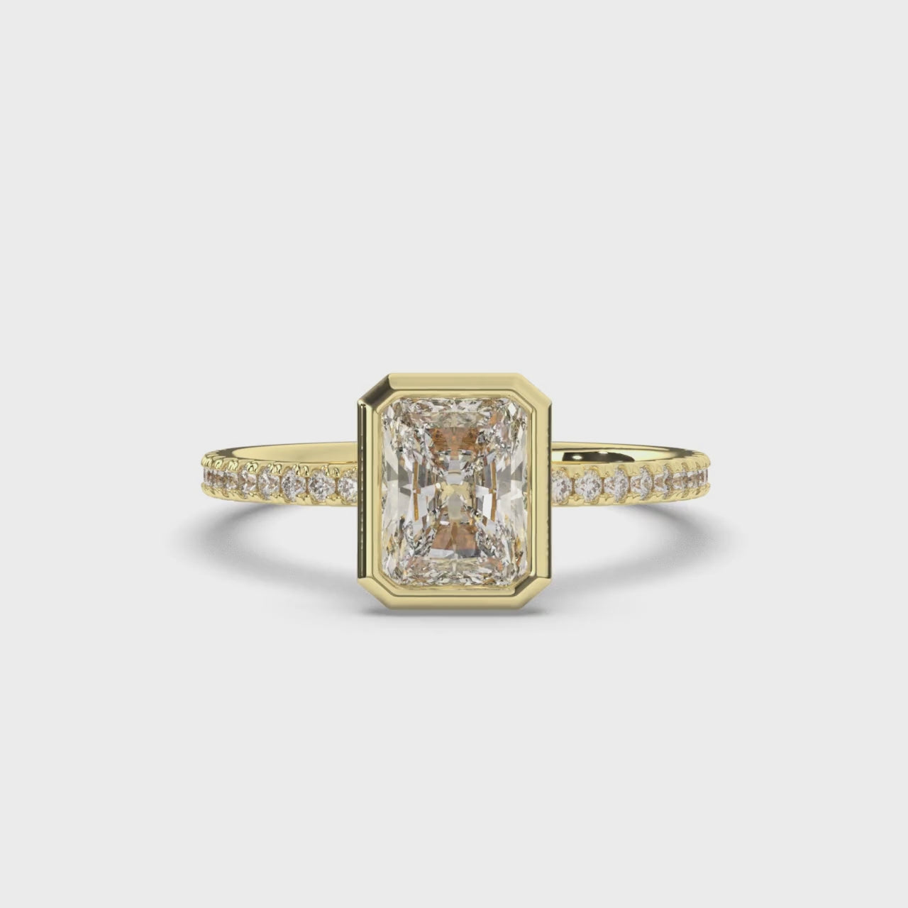 Add a touch of sparkle with the Radiant Bezel Setting. This ring features a stunning radiant-cut lab-grown diamond set in a sleek bezel, which highlights its brilliant shine while keeping it secure. The clean lines of the bezel setting let the diamond take center stage, creating a modern yet timeless look.