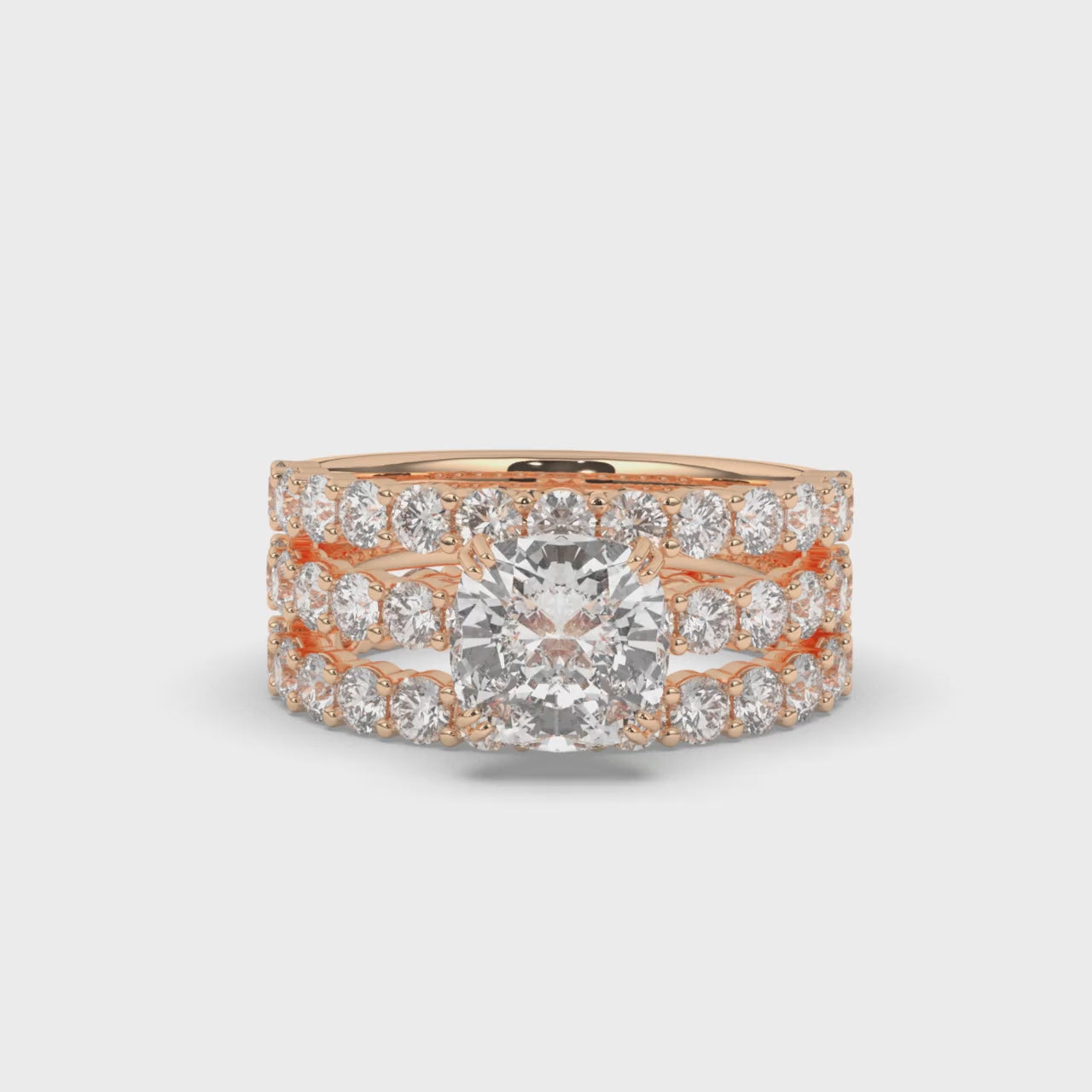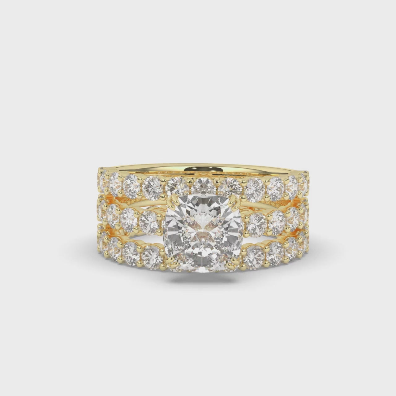 Make a grand entrance with our Three Ring Cushion & Round Lab-Grown Diamond Bridal Set. Featuring a stunning cushion-cut center stone surrounded by a sparkling band of round diamonds, this set is available in 18KT or 14KT options. IGI certified for quality, this set offers a luxurious touch to your special moments.